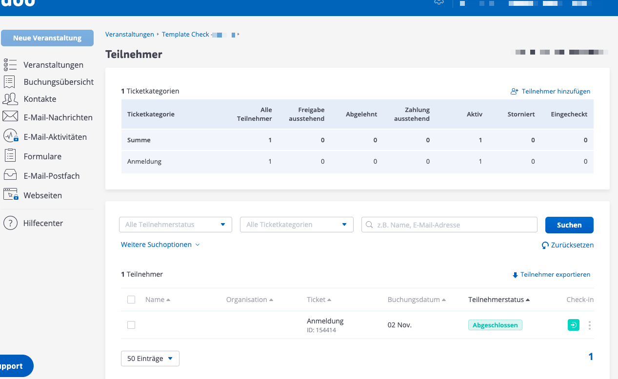 Rufen Sie im entsprechenden Veranstaltungsaccount das Veranstaltungsdashboard und klicken Sie auf „Teilnehmer“