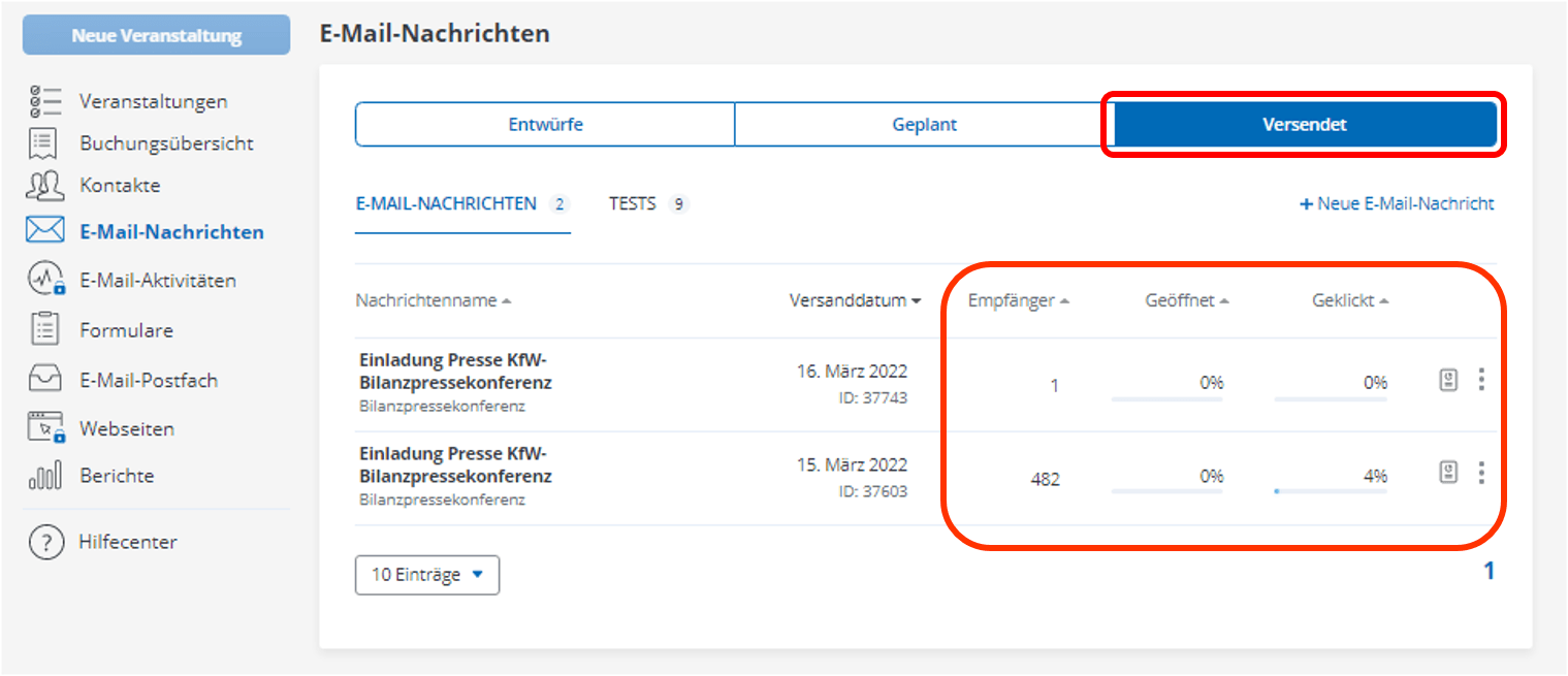 Nach dem Versand wird der Status Ihrer E-Mail automatisch auf den Status "Versendet" geändert. Wählen Sie den Reiter "Versendet" aus, hier erhalten Sie bereits erste Angaben zum Erfolgsbericht.