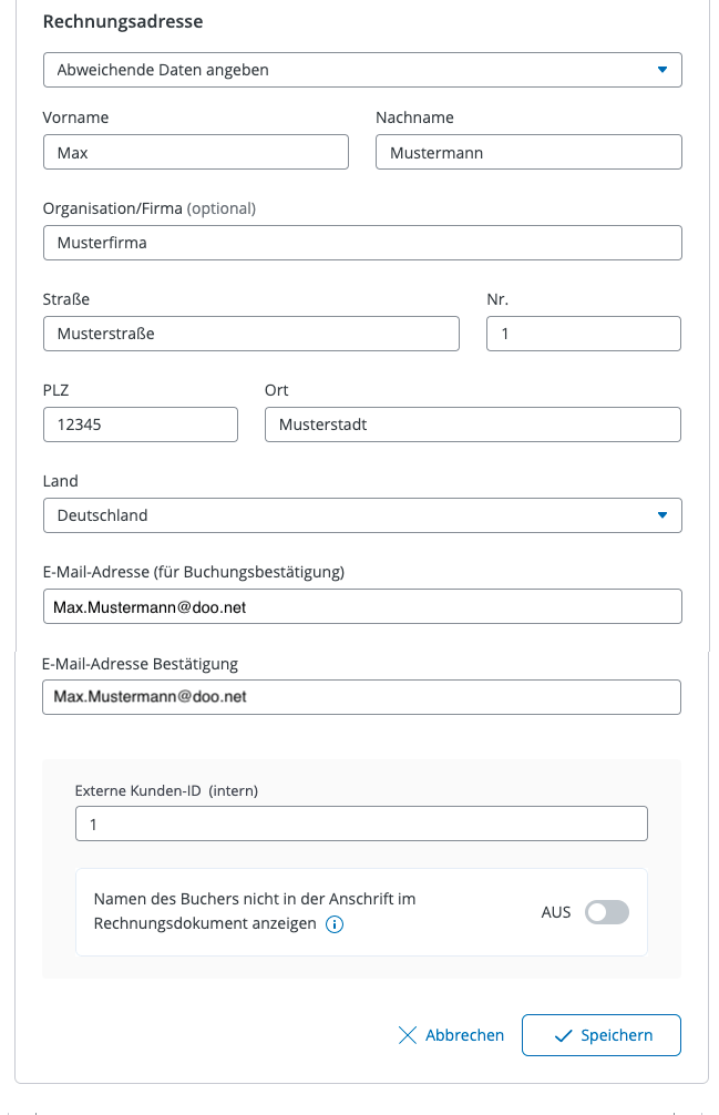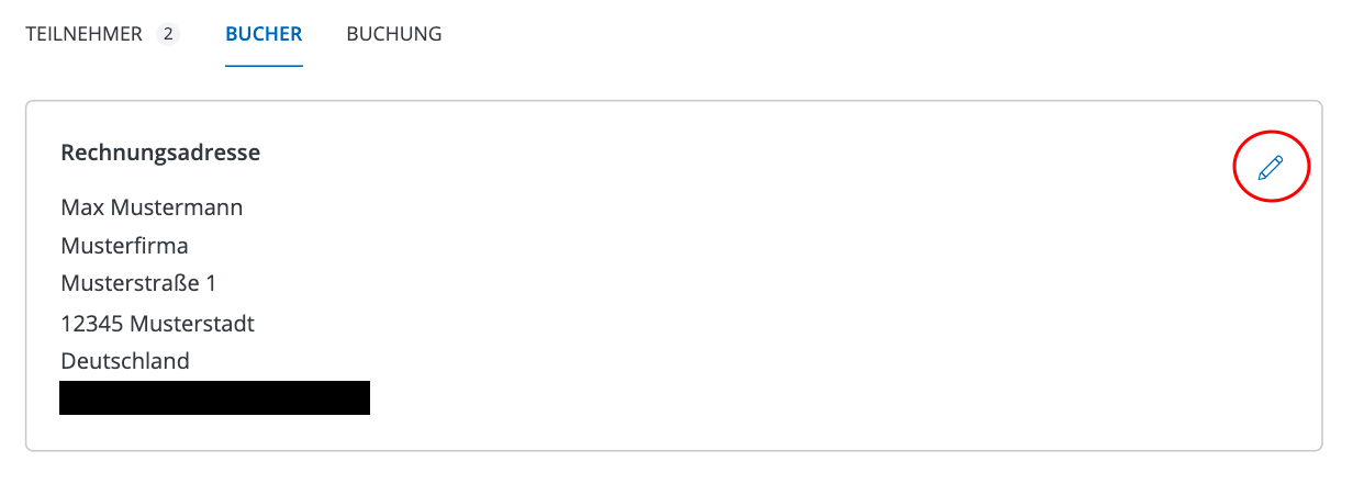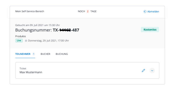 Nach der Eingabe von gültigen Daten erscheint die Übersicht der Buchung. Durch Auswählen des Stift-Symboles können die Daten für Bucher und Teilnehmer abgeändert werden.