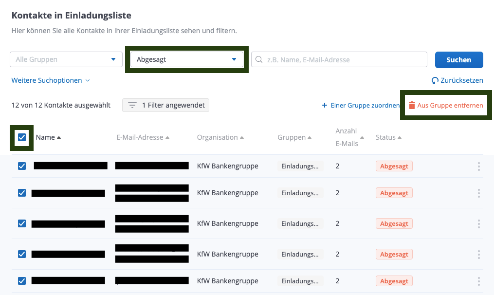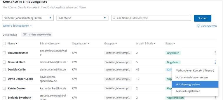 - In der unteren Tabelle „Kontakte in Einladungsliste“ wählen Sie im Reiter „Status“ die Option „abgesagt“ aus