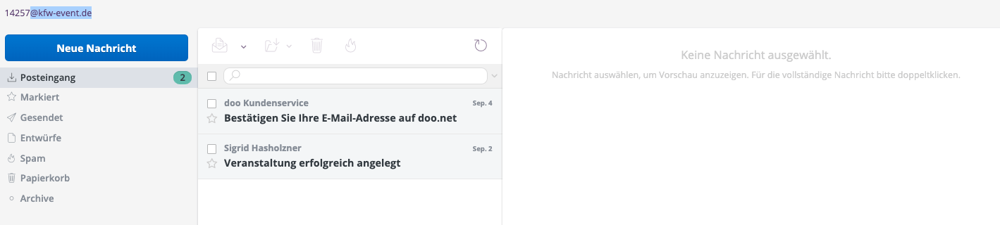 Die dazugehörige E-Mail-Adresse befindet sich links oben. Sie besteht aus einer Nummer und dem Domainteil, welcher bei Erstellung der Veranstaltung ausgesucht wurde.