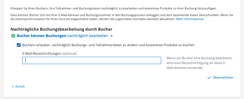 Damit Daten selbst von den Besuchern geändert werden können, müssen Sie in den Veranstaltungseinstellungen die Funktion "Nachträgliche Buchungsbearbeitung durch Bucher" aktivieren. Sie finden diese Einstellung unter dem Punkt "Buchungsbedingungen, Storno & Buchungsfreigabe".