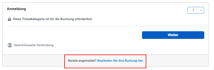 Wenn Sie die Möglichkeit der Nachträglichen Bearbeitung für eine Veranstaltung aktiviert haben, erscheint in der Buchungsmaske unter der Ticket-Auswahl die Information: "Bereits angemeldet? Bearbeiten Sie Ihre Buchung hier".