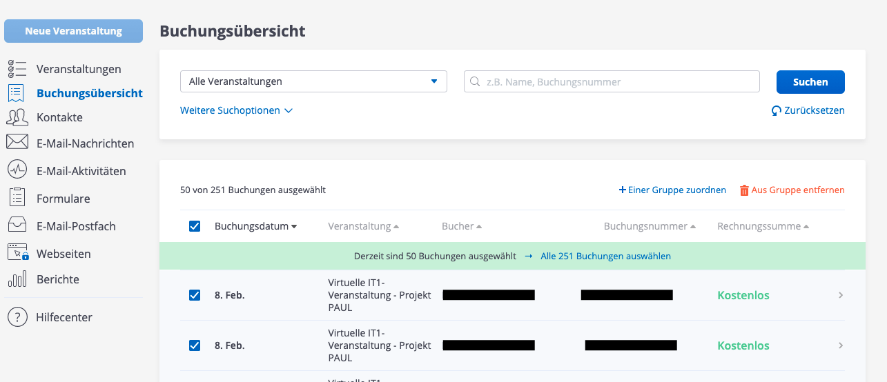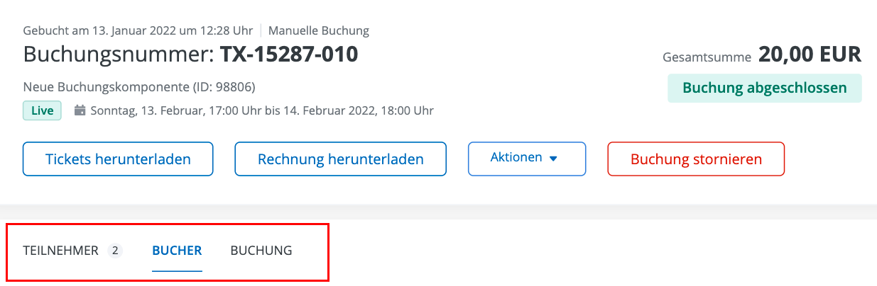 - Buchungen einsehen - Hier findet man den Überblick über alle Buchungen die es bereits in der Veranstaltung gibt. Details der Buchungen können bearbeitet werden (etwa eine neue Rechnungsadresse eintragen) oder Dokumente (Tickets, Rechnungen) können neu verschickt werden.