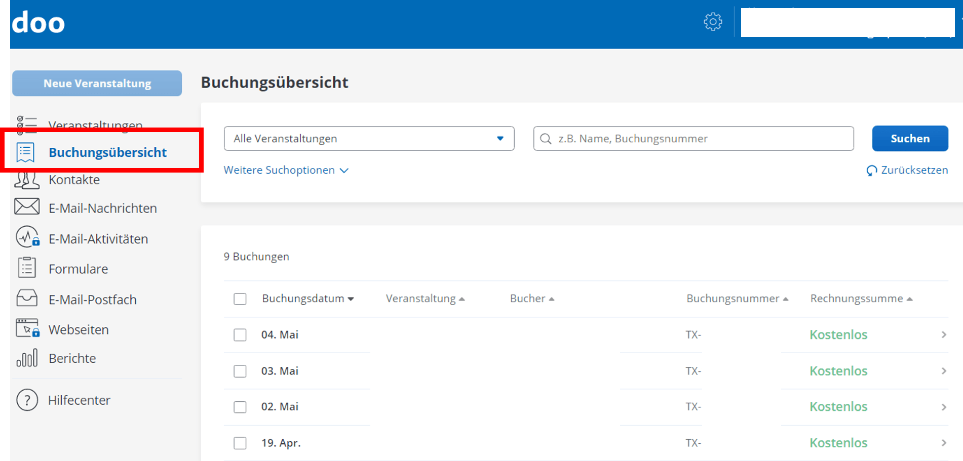 - Öffnen Sie über den Reiter „Buchungsübersicht“ alle Buchungen