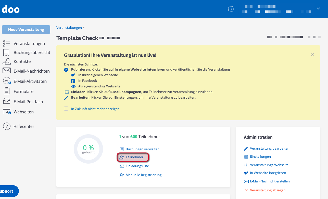 - Öffnen Sie über den Reiter „Veranstaltungen“ Ihre angelegte Veranstaltung dooNet Backend
