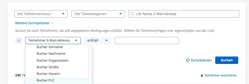 So können Sie zB nach dem Status oder der gebuchten Ticketkategorie suchen bzw. über die "Weiteren Suchoptionen" sogar nach Antworten aus optionalen Abfragefeldern filtern.