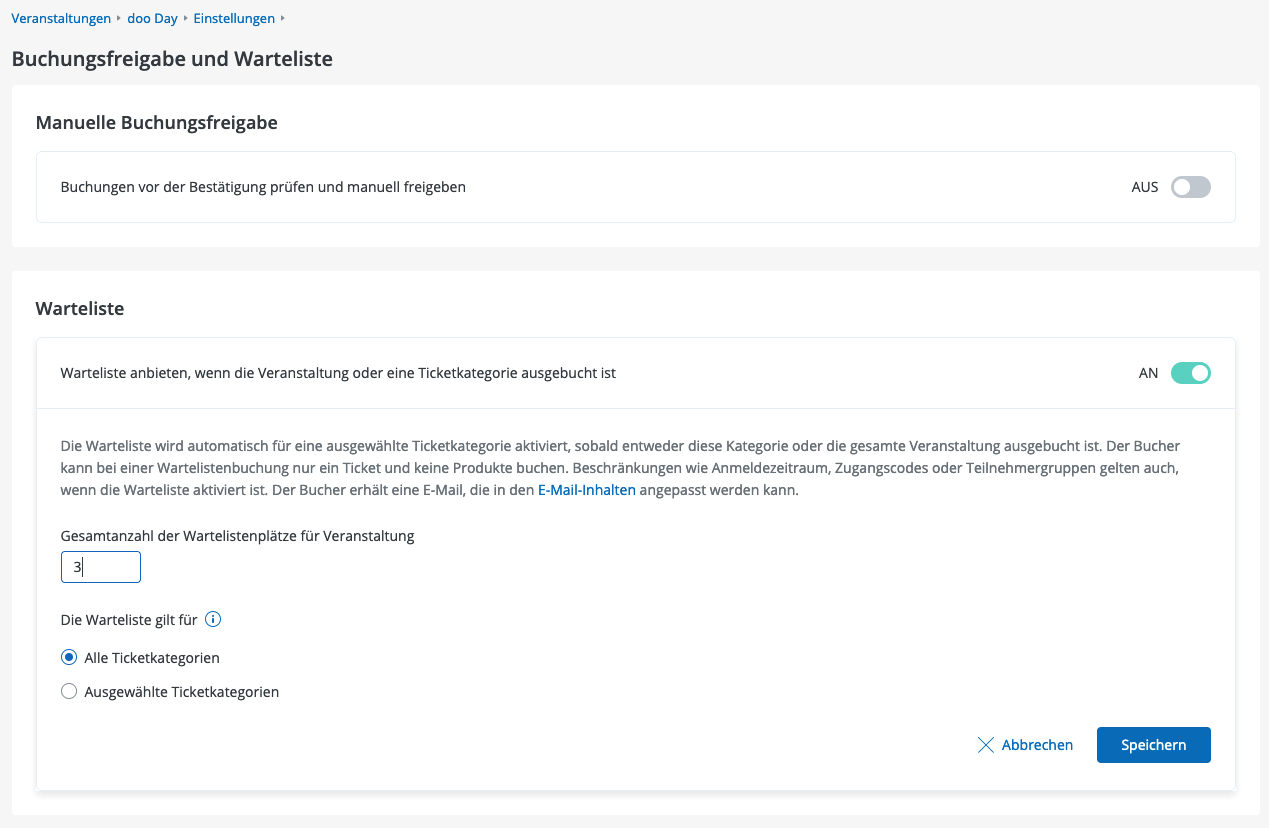 Als Veranstalter gibt es auf der Veranstaltungseinstellungsseite die Option bei „Buchungsfreigabe und Warteliste“ die Warteliste für die Veranstaltung konfigurieren.