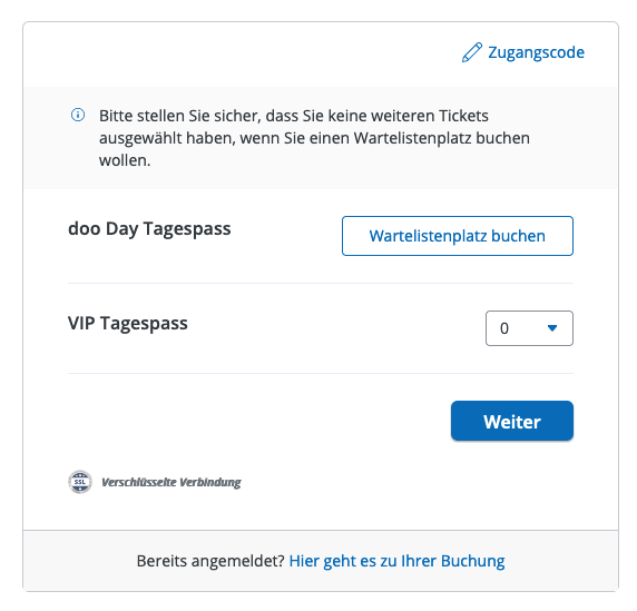 - Bei einer Wartelistenanmeldung kann nur 1 Ticket ausgewählt werden. Mehrere Tickets oder Produkte können nicht mitgebucht werden.
