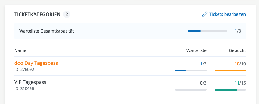 Die Wartenlistenauslastung kann in der Veranstaltungsübersicht und den -details gesehen werden.