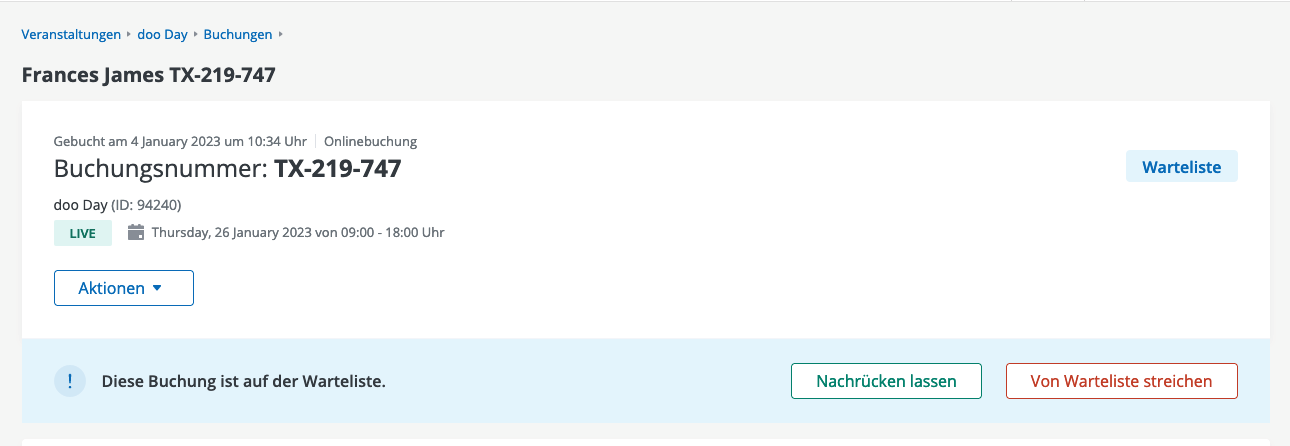 Wenn ein Platz frei wird, kann der Teilnehmende, der/die nachrücken soll, in den Buchungsdetails bestätigen.