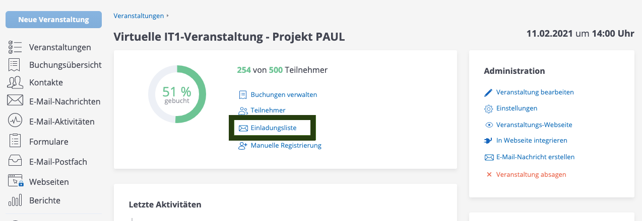 Die Einladungsliste kann erst nach dem Live schalten einer Veranstaltung angelegt werden. Rufen Sie hierzu die Veranstaltung über die Veranstaltungsübersicht auf und klicken auf der Veranstaltungsdetail-Seite mittig auf "Einladungsliste".